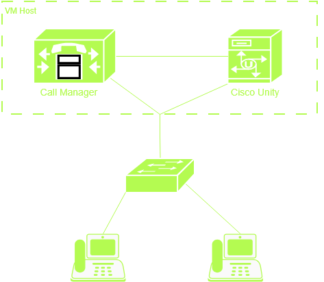 The way I have my call manager and Cisco unity lab setup is that I have both call manager and Cisco unity installed on my Dell power edge R630server that is running VMware ESXI and I have that connected to a 2960 switch my two Cisco 7940 VOIP phones are connected to which provides the POE to the phones. To access my voice map, I have USB Ethernet adapter with the same subnet as my voice lab.